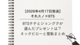 2026年4月17日放送の『それSnow Manにやらせて下さい』では、BTSのV(テテ)とジョングクが出演し、トークやプレゼント企画が話題になりました。